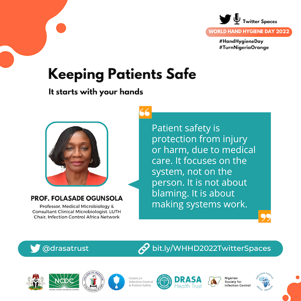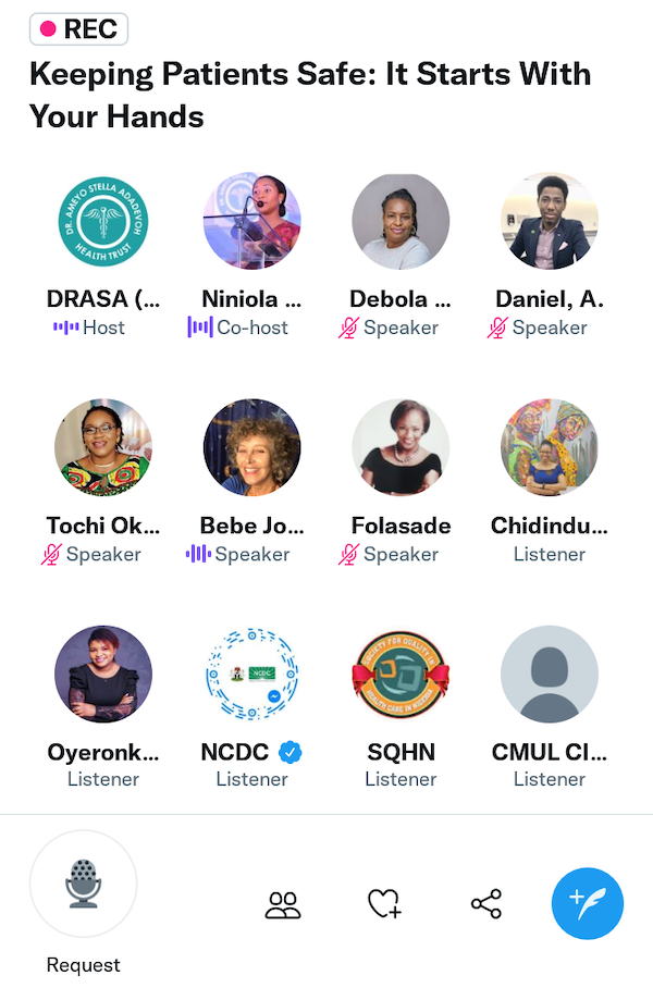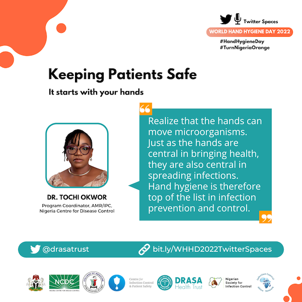 As part of our activities to commemorate the 2022 World Hand Hygiene Day (WHHD), we collaborated with partners at the Nigeria Centre for Disease Control (NCDC), Centre for Infection Control and Patient Safety (CICaPS), Infection Control Africa Network (ICAN) and Nigerian Society for Infection Control (NSIC) to host a Twitter Spaces event, on the 4th of May, 2022.